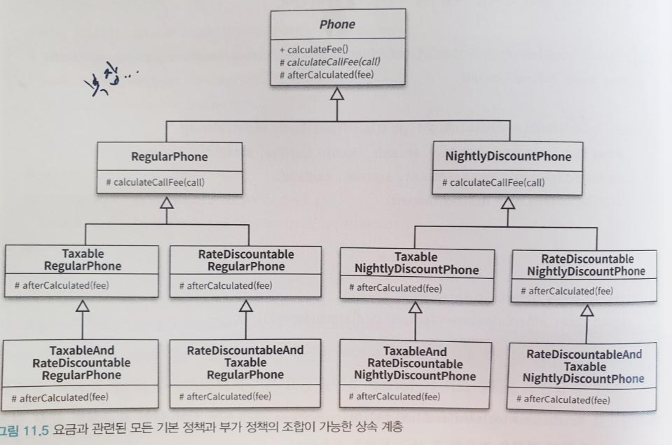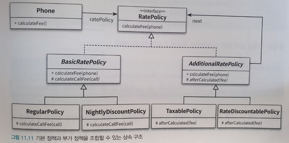 만약에 여기서 새로운 기본 정책이 추가된다면 phone을 상속받는 새로운 계층이 그대로 하나 추가될 것이다. 하나의 기능을 추가하기 위해 많은 수의 클래스를 추가해야 할 경우를 클래스 폭발 문제 또는 조합의 폭발 문제라고 부른다.