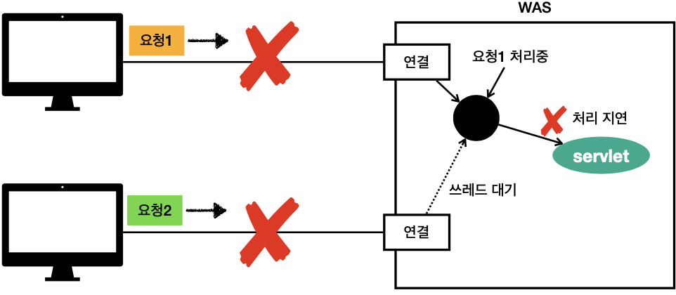 요청1이 진행 중에 요청2가 들어오면 요청2는 요청1이 끝날때까지 대기한다.