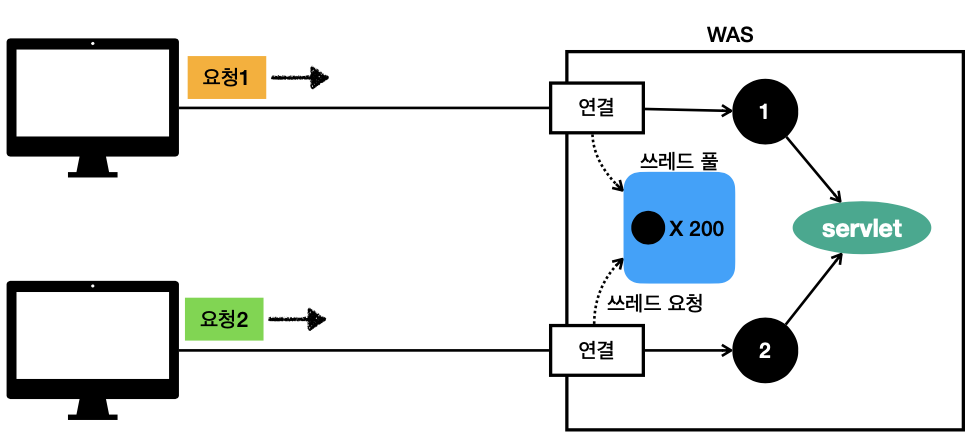 - WAS가 멀티 쓰레드 부분을 처리한다.