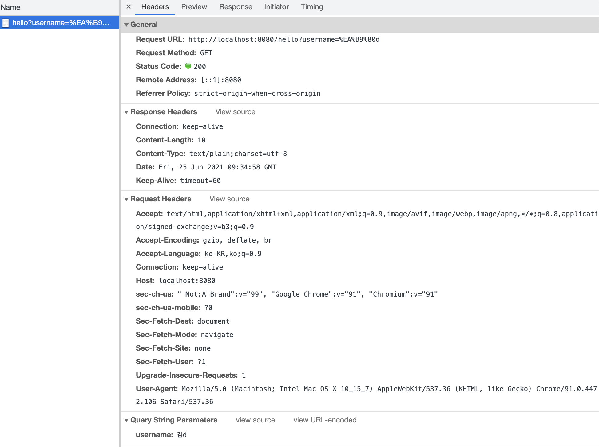 2021-06-25 18:34:58.098 DEBUG 9485 --- [nio-8080-exec-3] o.a.coyote.http11.Http11InputBuffer : Received [GET /hello?username=%EA%B9%80d HTTP/1.1