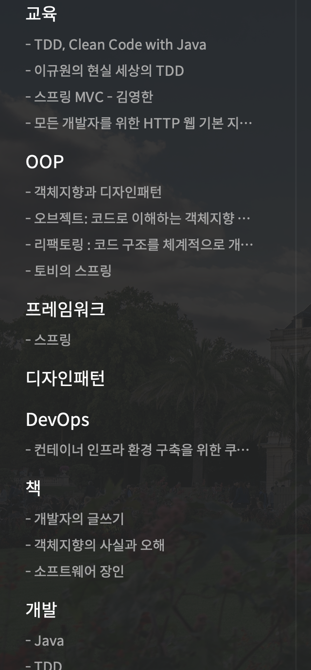 글이 없는 카테고리도 있지만 하나씩 글로 채울 수 있을거라 생각된다.