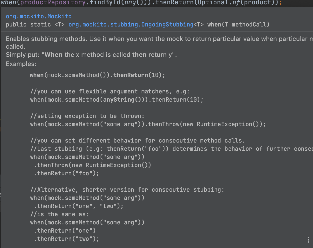 BDDMockito는 기존 Mockito 상속받아 BDD 스타일로 사용하게끔 변경된 것으로 자세한 내용은 BDDMockito 코드를 참고하면 이해가 빠르다.