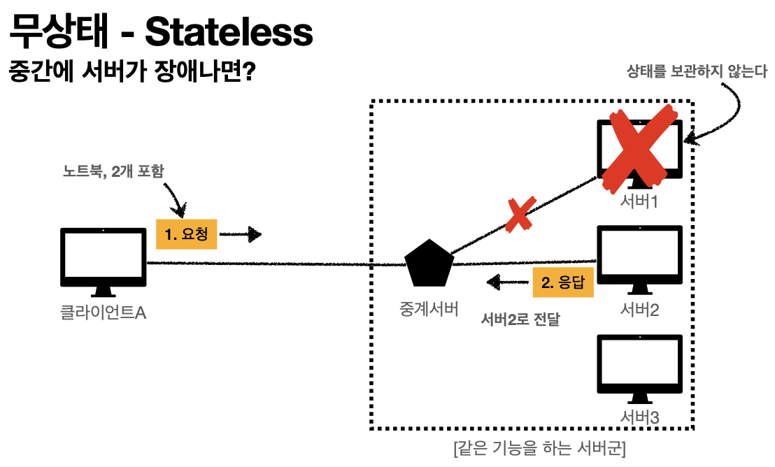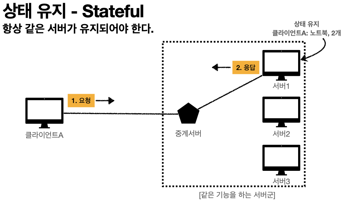 Stateless - 다른 점원이 바뀌어도 된다. 고객이 몰리면 그만큼 점원을 투입해도 문제 없다.