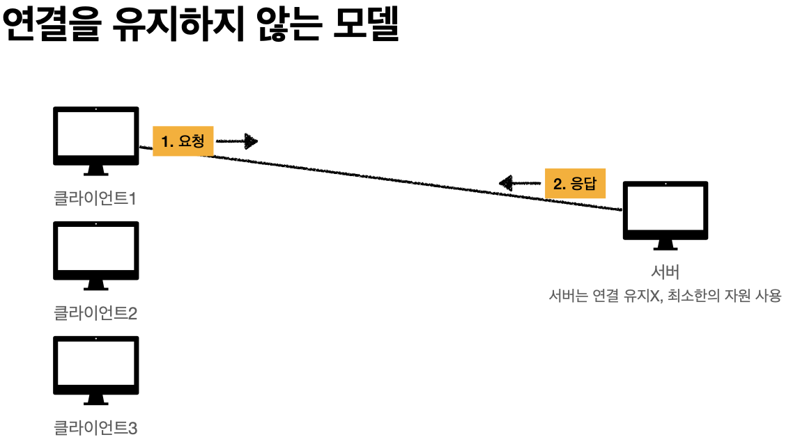 연결을 유지 안하는 경우, 서버는 클라이언트의 요청에 응답만 보내주고 연결이 끊기기 때문에 이전과 다르게 서버는 최소한의 자원으로 유지할 수 있게 된다.