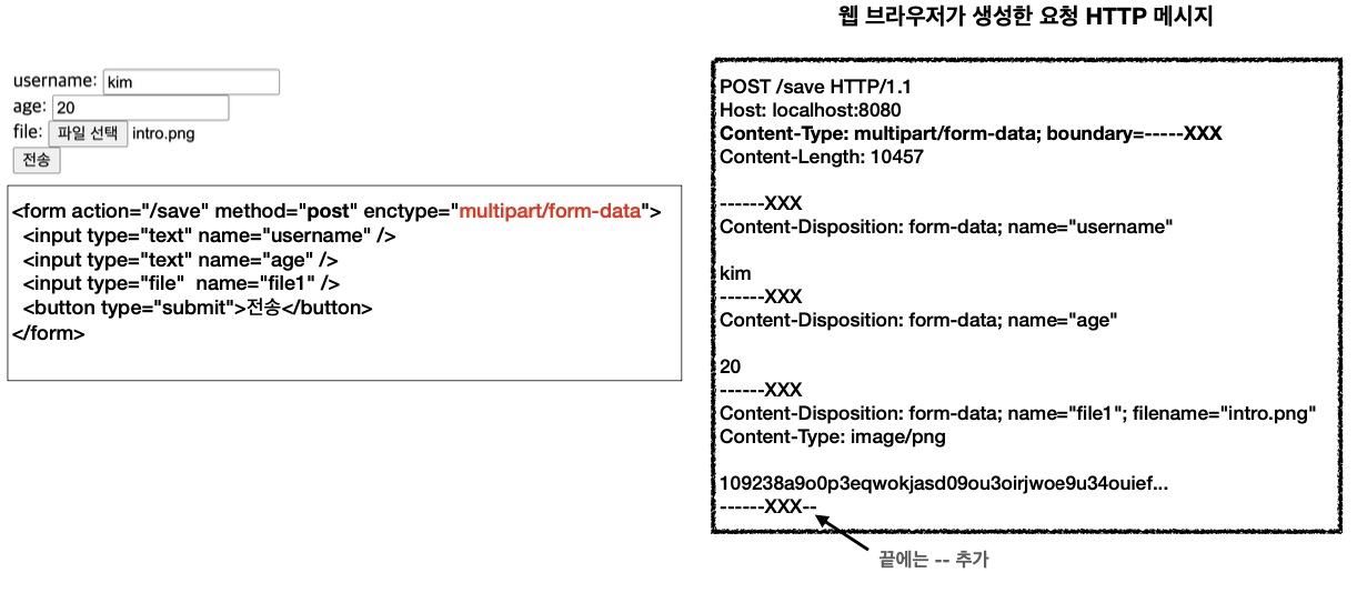 - 다른 종류의 여러 파일과 폼의 내용 함께 전송 가능 (이름이 multipart)