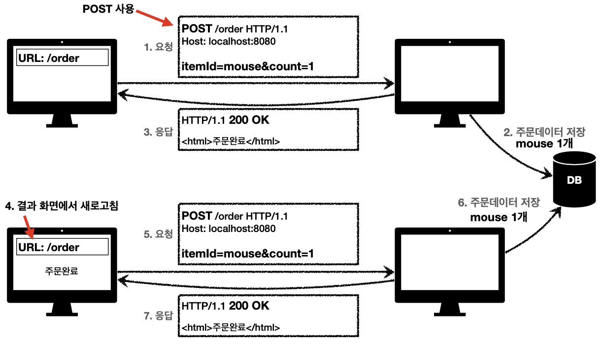 - 새로고침은 다시 등록 요청을 하게 됨 -> 중복 주문이 될 수 있다.