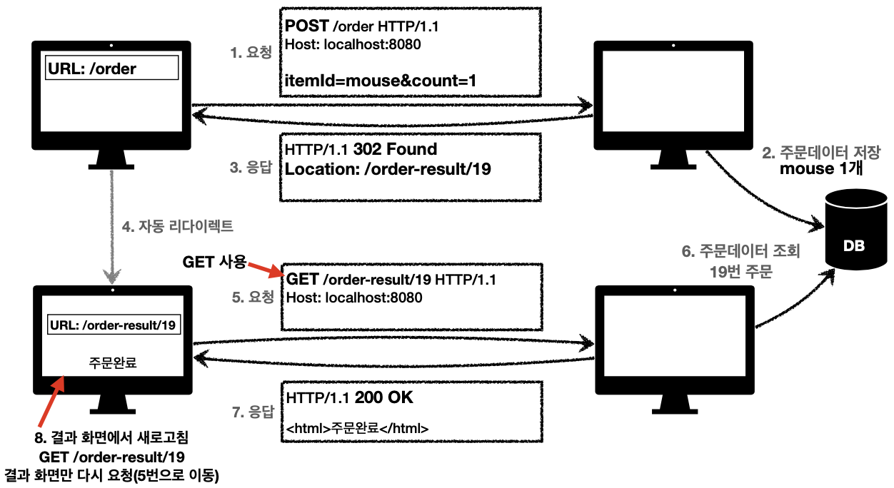 - POST로 등록 요청 후에 결과화면을 GET 메서드로 리다이렉트 (Post/Redirct/Get)