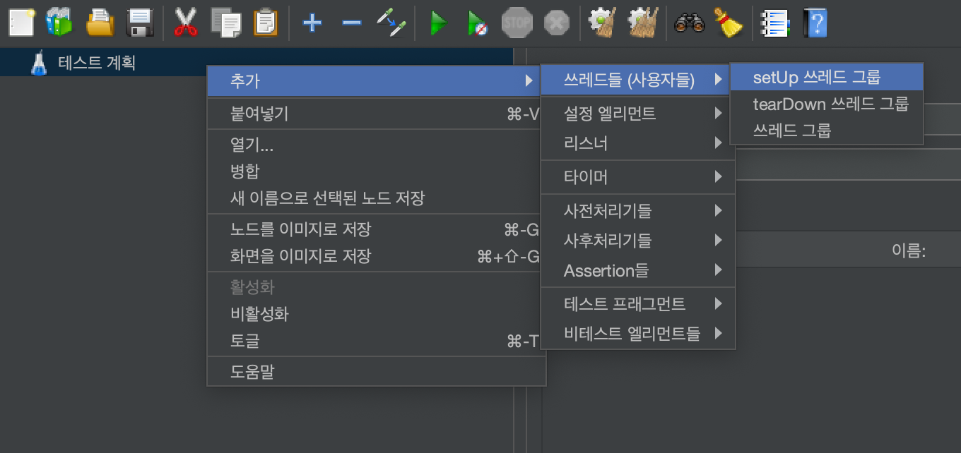 테스트 계획(test plan) 은 최상위 디렉토리를 나타낸다. 우측 클릭하면 다음과 같이 나온다.