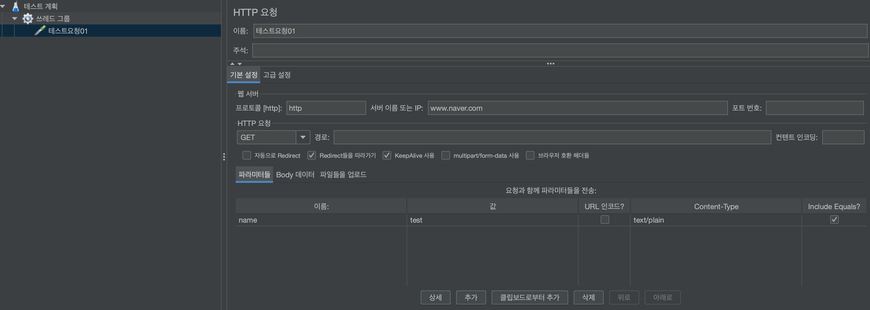 서버 이름 또는 IP : 성능테스트 진행할 주소(www.naver.com / www.google.com) 또는 ip를 입력한다 (로컬이라면 localhost)