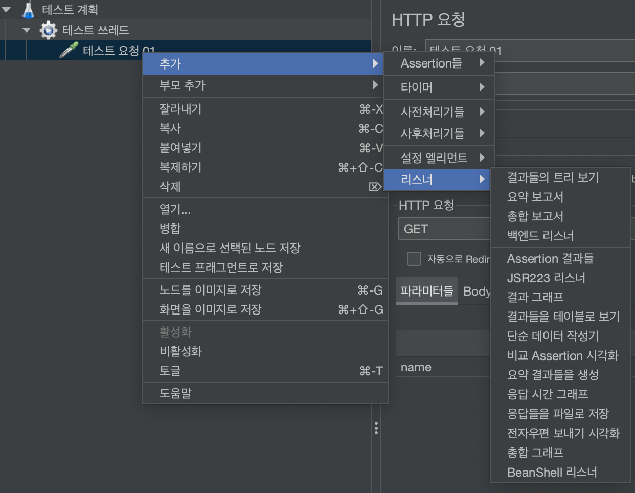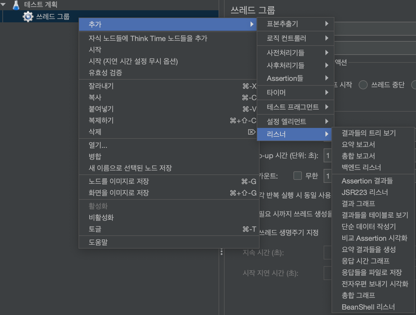 테스트를 위해 쓰레드그룹에 쓰레드 여러개와 리스너들을 추가한다