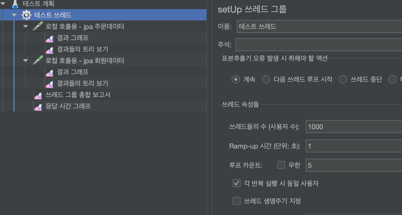 루프 카운트 : 가상의 사용자들이 몇번 반복할 것인지 정한다. 무한 체크박스를 선택하면 정해진 시간동안 무제한으로 실행된다.