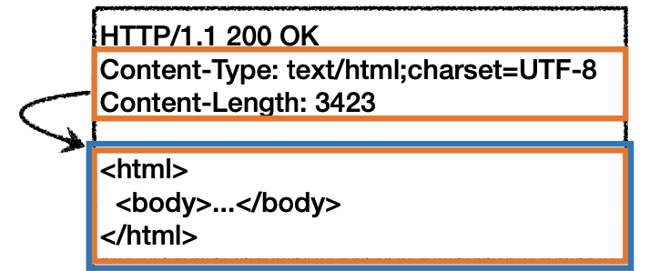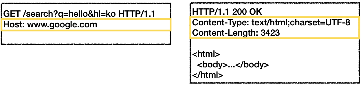 - Entity 헤더 : 엔티티 바디 정보, 예) Content-Type: text/html, Content-Length: 3423