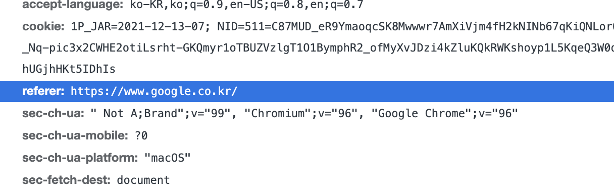 - A -> B로 이동하는 경우 B를 요청할 때 Referer: A를 포함해서 요청