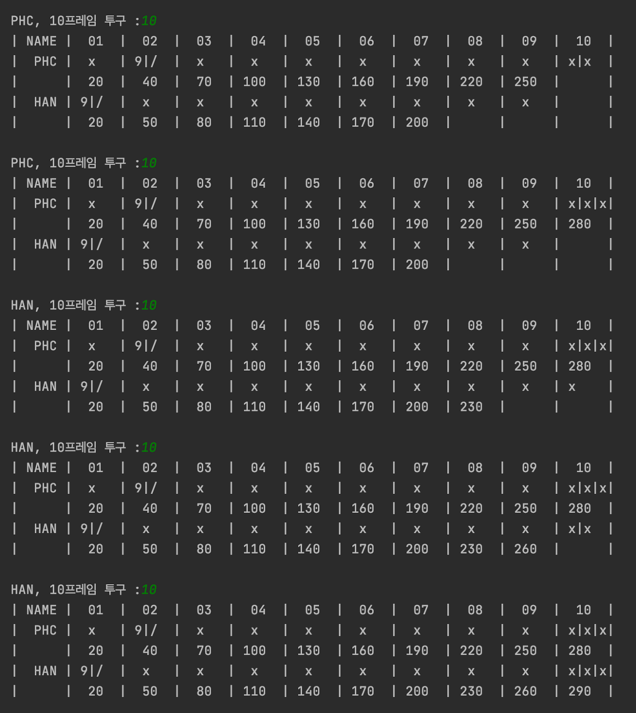 - 스트라이크 경우, 다음과 다다음 투구 때 쓰러진 핀 개수만큼 보너스를 획득한다 (보너스 점수 2번)
