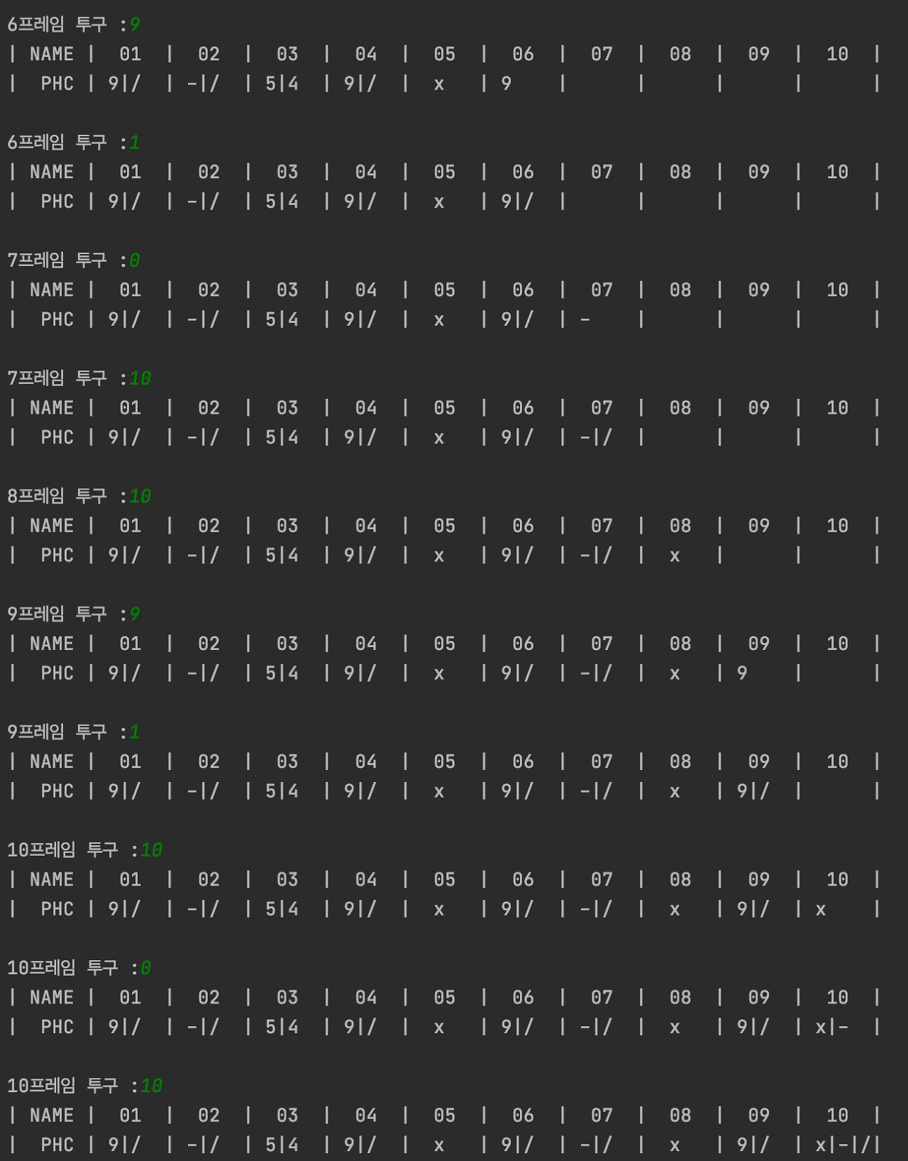 볼링은 10 프레임으로 진행되며 1~9프레임과 10프레임은 서로 다른 특징을 갖고 있어서
