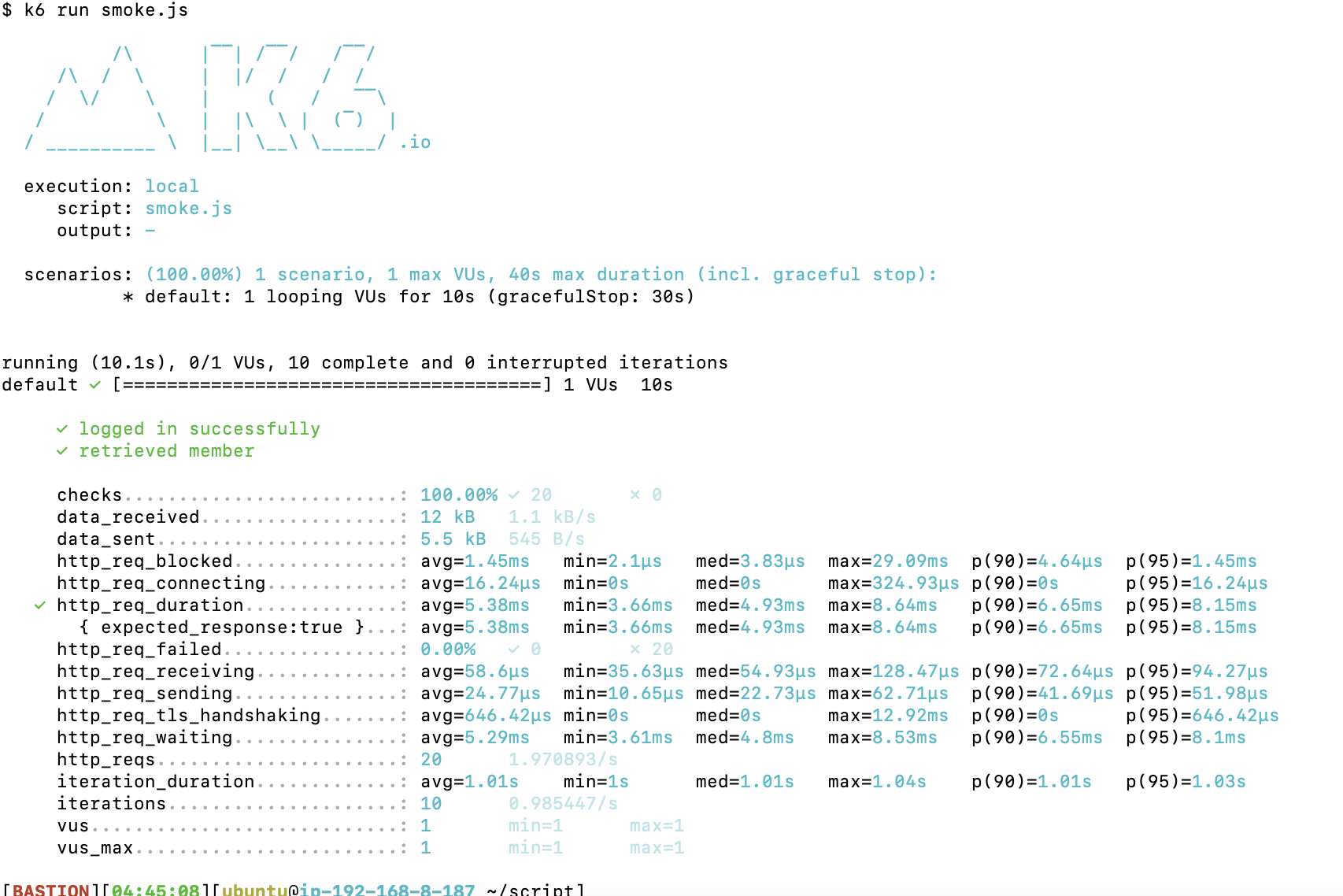 결과에서 봐야 할 점은 우선 http_req_duration로 평균, 최소, 최대 시간을 알 수 있고