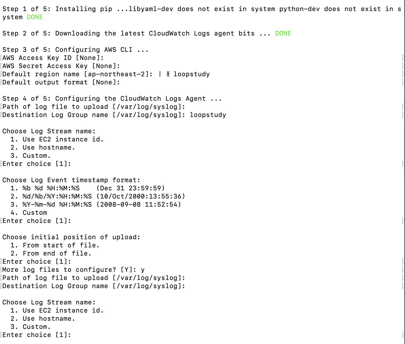 설치가 되었으면 다음 명령어로 로그가 쌓일 log_group_name 값을 변경해야 한다.