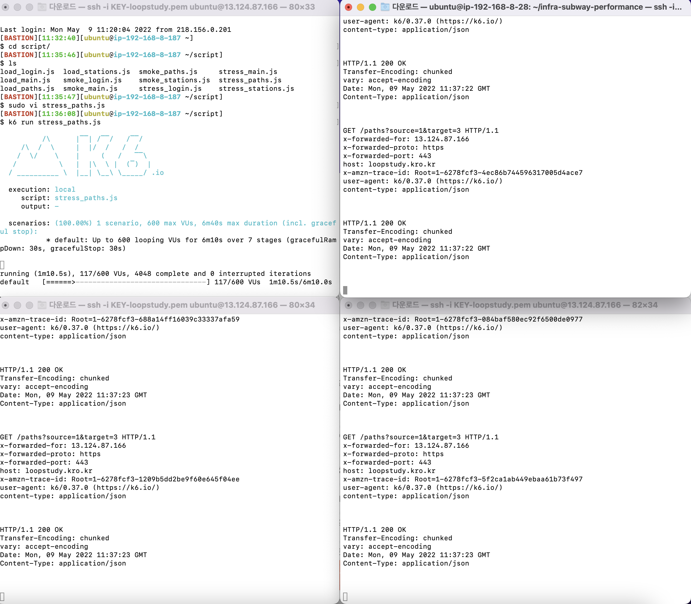 지난 주 테스트에 비교하면 많은 부하를 버티는 걸 알 수 있다.