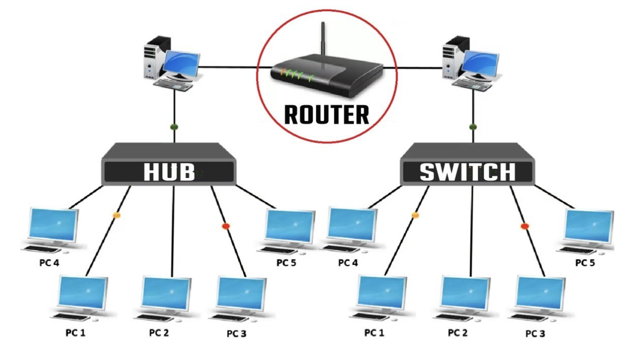 - HUB : 네트워크에서 여러 대의 컴퓨터, 네트워크 장비를 연결하는 장치다. 한대의 허브를 중심으로 별 모양으로 연결된다, 같은 허브로 연결된 컴퓨터와 네트워크 장비는 상호 간의 통신이 가능해진다.