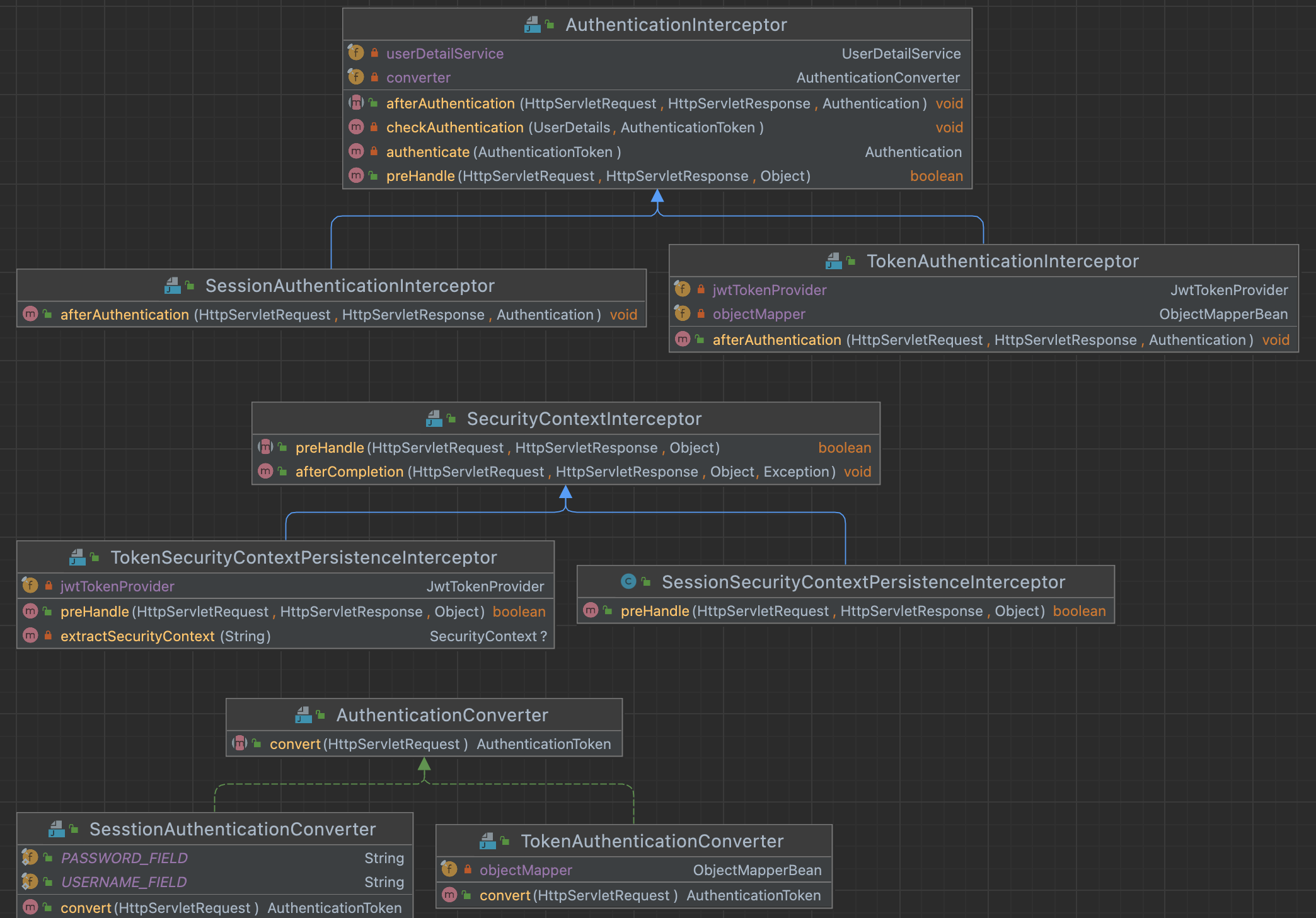 제공된 코드를 보면 HandlerInterceptor를 상속받은 세션 인증 로그인의 SessionAuthenticationInterceptor와 토큰 기반 로그인의 TokenAuthenticationInterceptor로 구분된다.