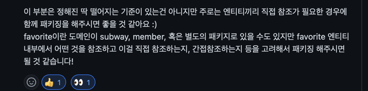 처음에는 즐겨찾기를 member 패키지에서 구현했지만, subway 패키지로 옮기는 게 좋을 정도로 subway 의존성이 많아 subway로 변경하기도 했습니다.