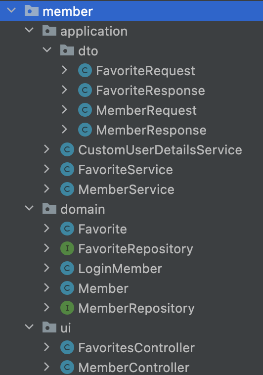 여기저기 패키지를 왔다 갔다 하다가 마지막에는 로그인한 member를 위한 기능이기 때문에 member 패키지에 넣었다. (비로그인에도 일시적인 즐겨찾기가 가능했거나 즐겨찾기 관련된 기능들이 많다면 더 고민을 해봤을 거 같다.)