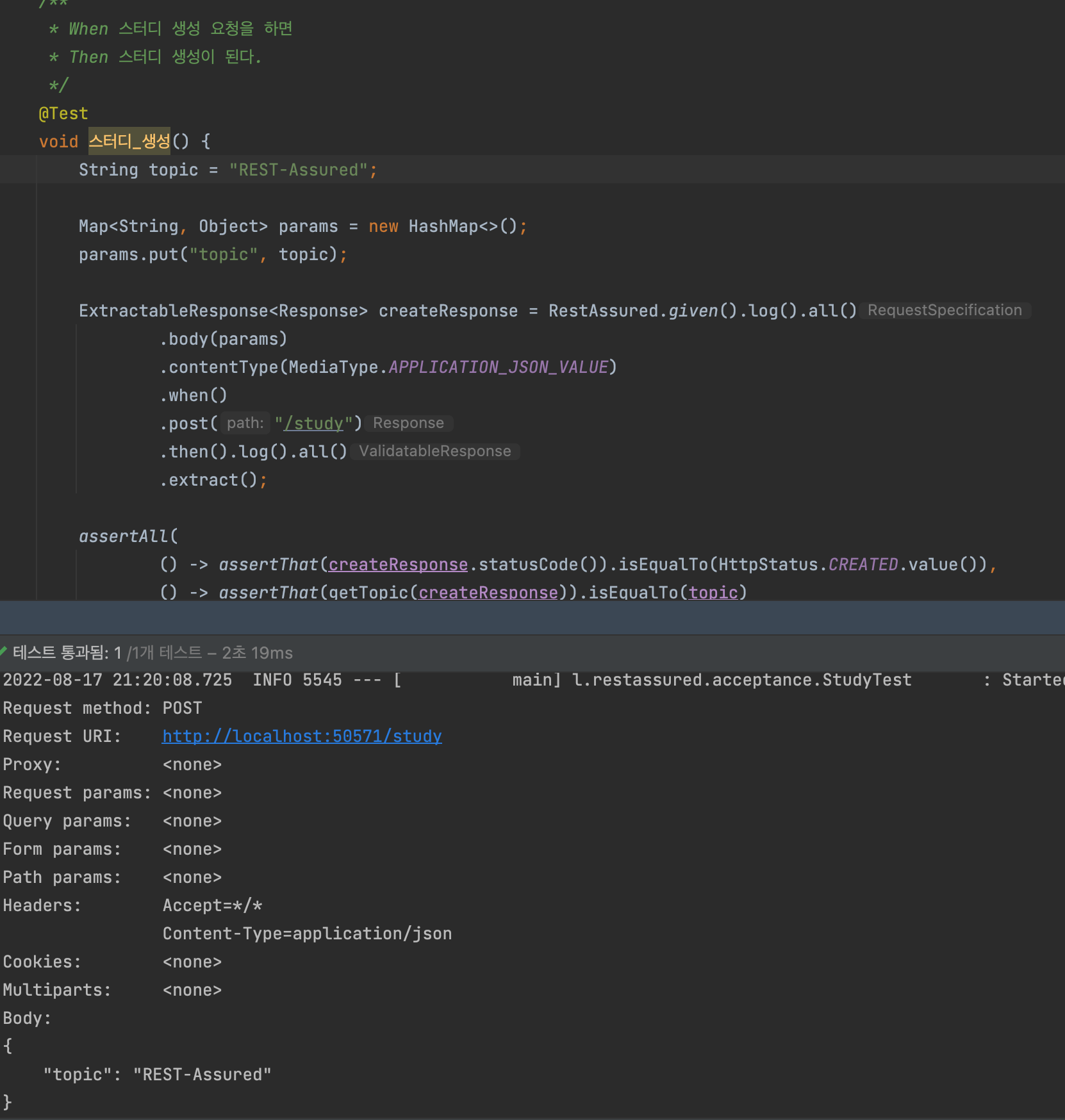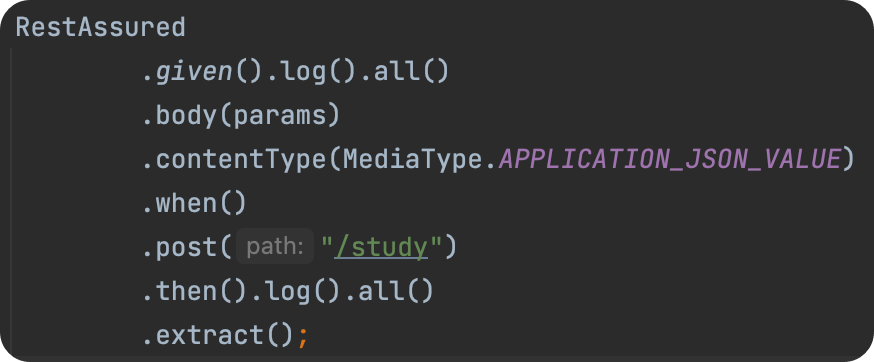 RestAssured로 작성된 코드를 보면 중복되는 로직이 많다. 예를 들면 스터디 생성하는 로직이다.