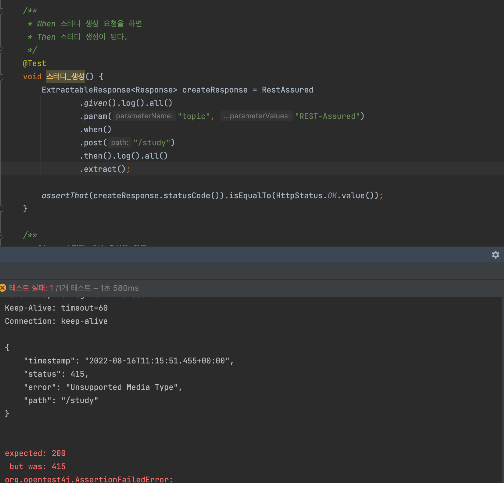 RestAssured로 작성된 코드를 보면 중복되는 로직이 많다. 예를 들면 스터디 생성하는 로직이다.