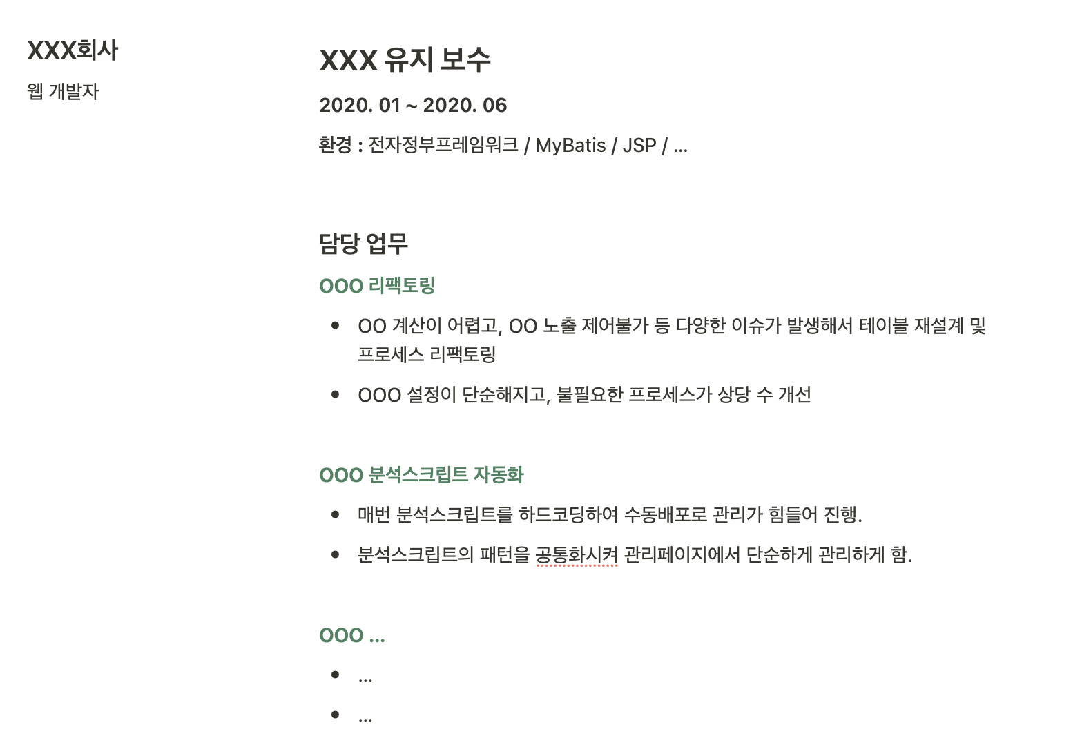- XXX 유지 보수가 하나의 플젝으로 보인다. 아래의 담당 업무는 오히려 하나의 플젝에서 담당한 업무밖에 인식이 안된다.