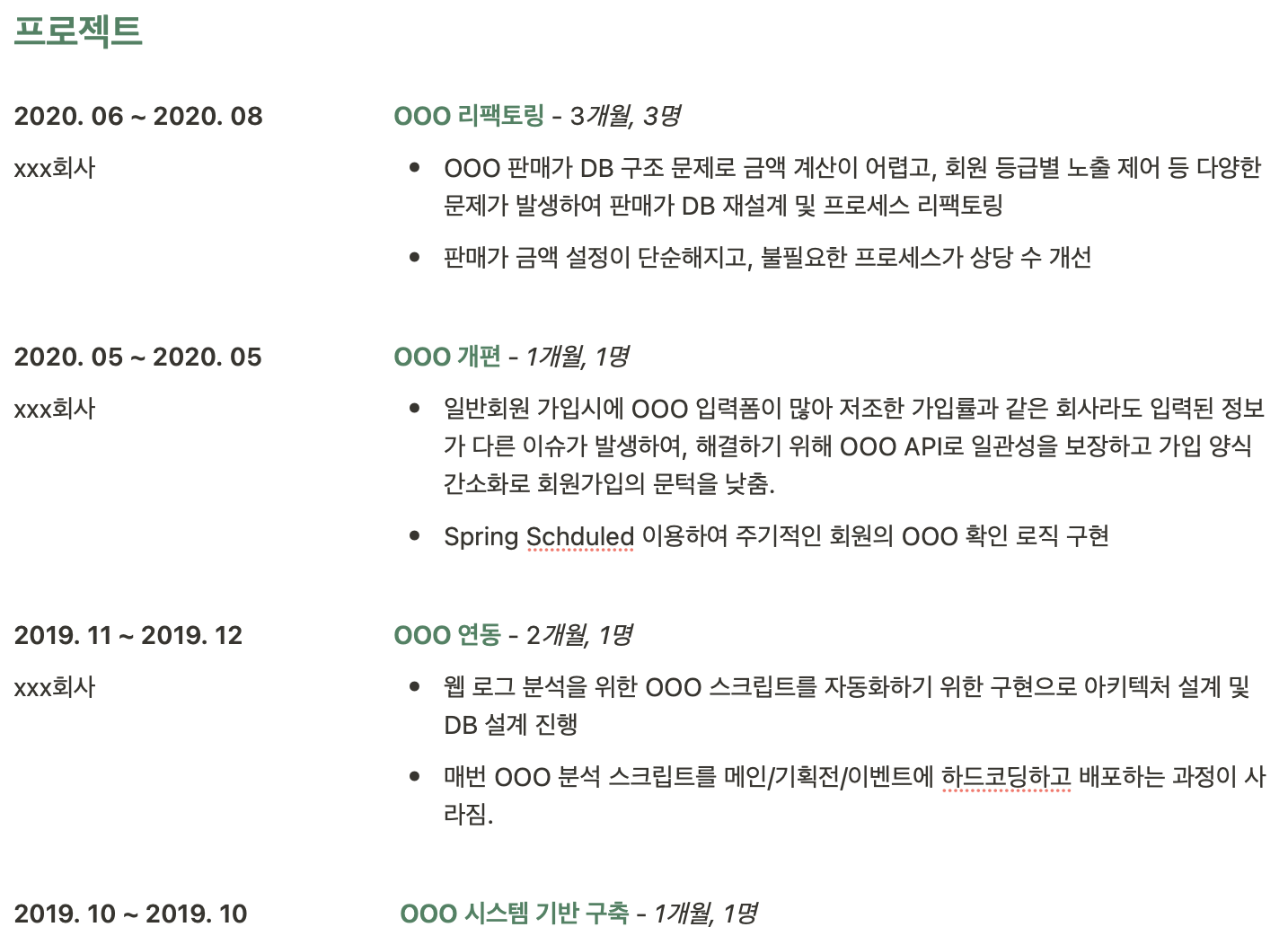 - 프로젝트 기간이 한두 달로 짧으면 크게 묶어서 1차 개편, 2차 개편 등으로 구분하고 내부에서 프로젝트를 구분해서 보여줘라. 프로젝트 사이 공백 기간에 유지보수를 적어도 된다.