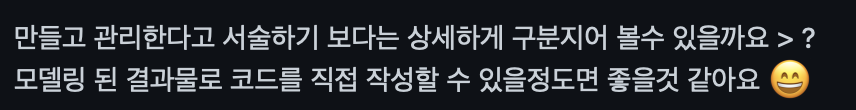 요구사항과 모델링 관점에서는 글로 표현하다 보니 이상한 부분을 많이 못 느끼셨을 수도 있을 것 같아요.