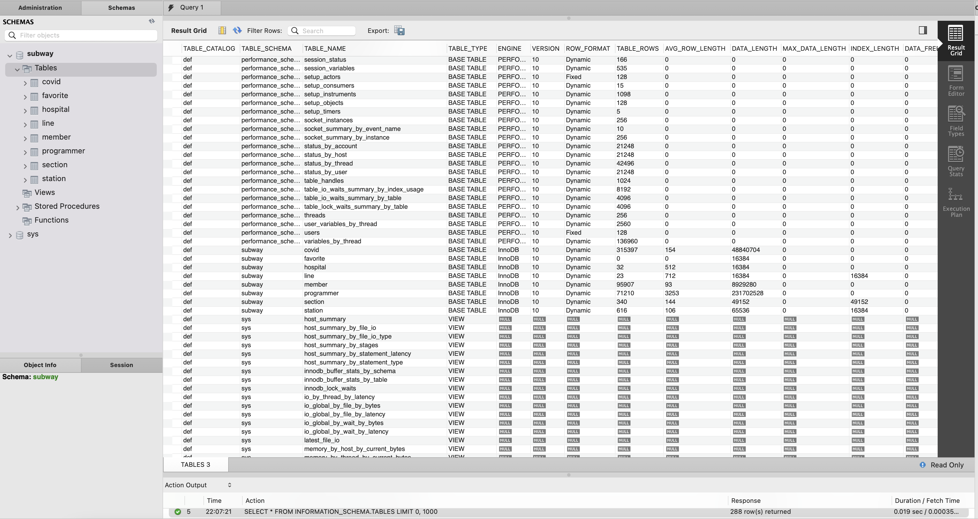 조회해보면 데이터 딕셔너리(메타 데이터)를 볼 수 있다.