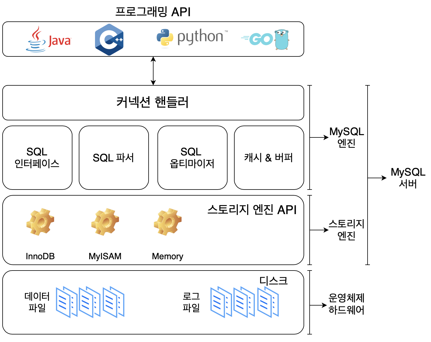 MySQL 서버는 크게 MySQL 엔진과 스토리지 엔진 2가지로 구분되며, 이 둘을 합쳐 MySQL 서버라 부른다.