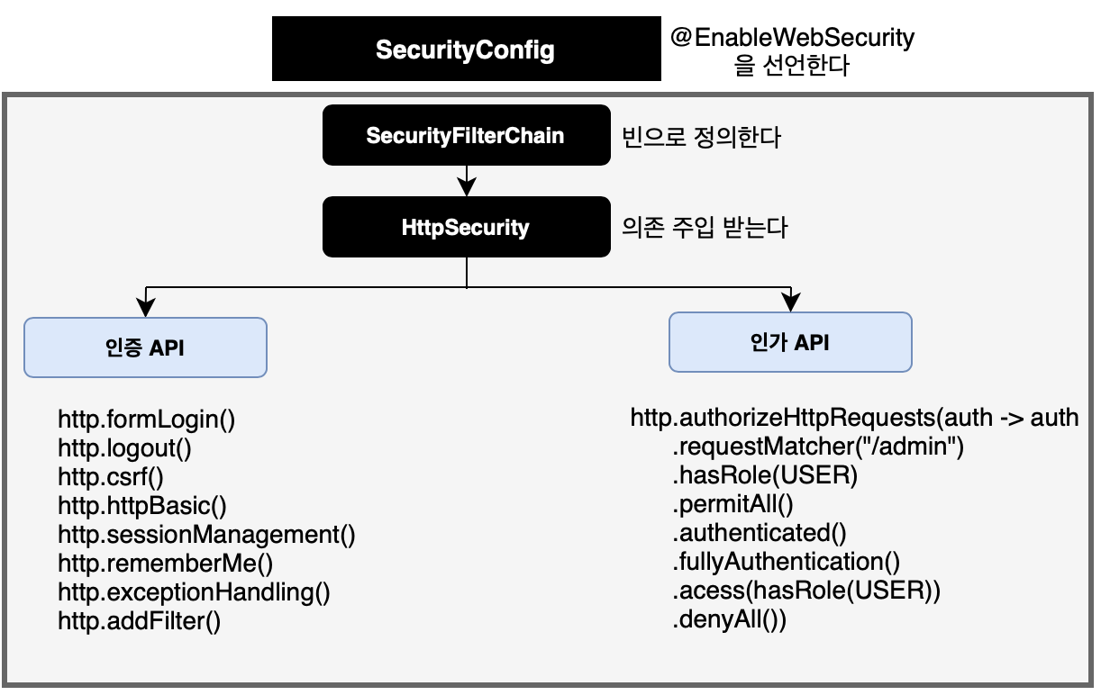 사용자가 정의하는 보안 기능 구현은 한 개 이상의 SecurityFilterChain 타입의 빈을 정의한 후 인증 API 및 인가 API 를 설정한다