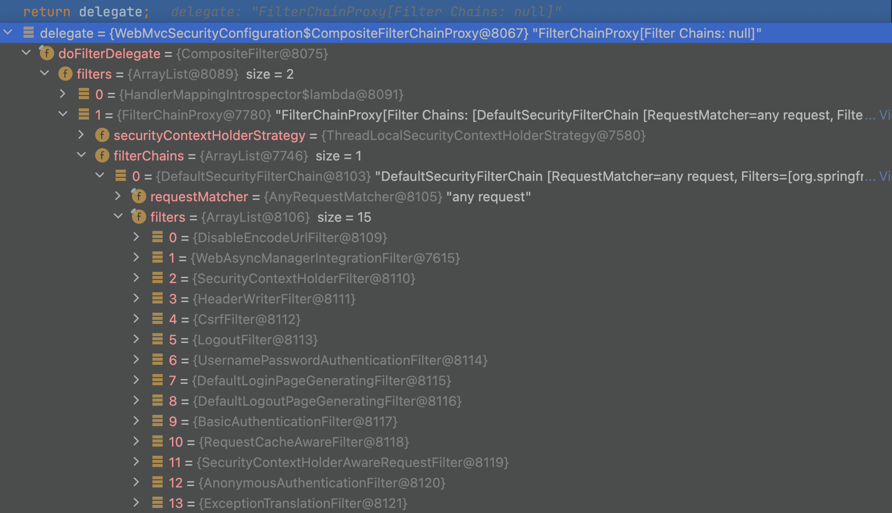 디버깅 모드로 애플리케이션을 실행하고 자원에 접근하면 DelegatingFilterProxy이 어떻게 작동하는지 알아보자.