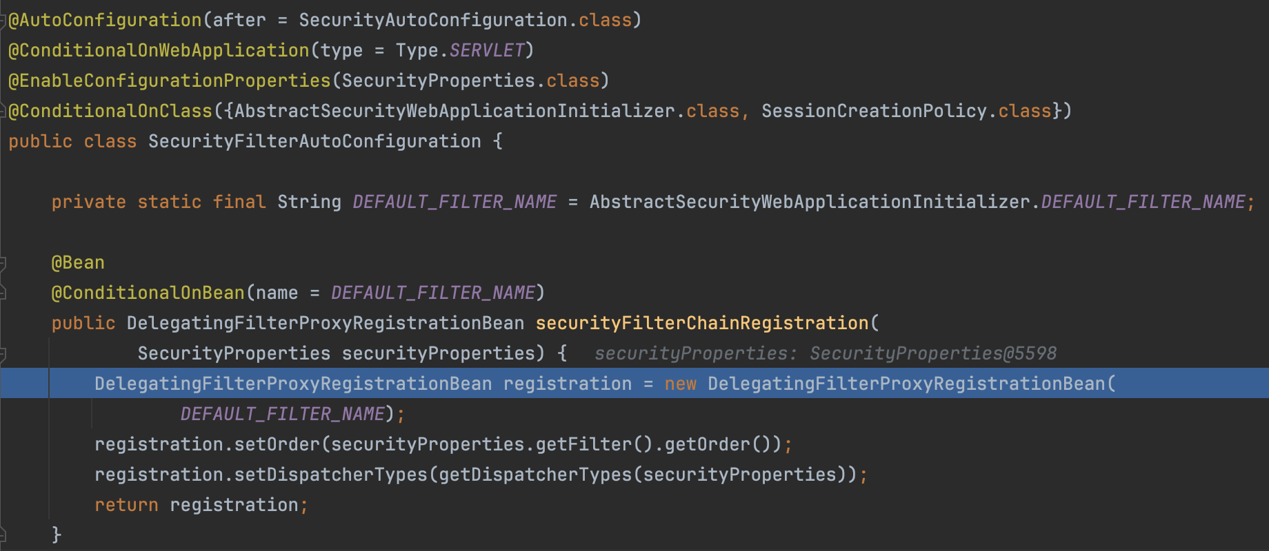 @ConditionalOnBean 으로 springSecurityFilterChain 빈이 있어야 생성되는 걸 알 수 있다.