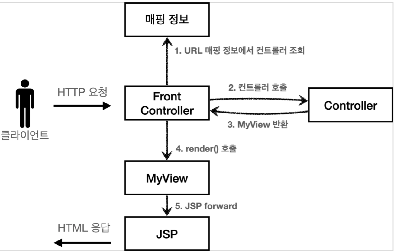 기존의 MyView는 컨트롤러에서 반환하지 않고, 프론트컨트롤러에서 viewResolver로 반환하게 변경했다.