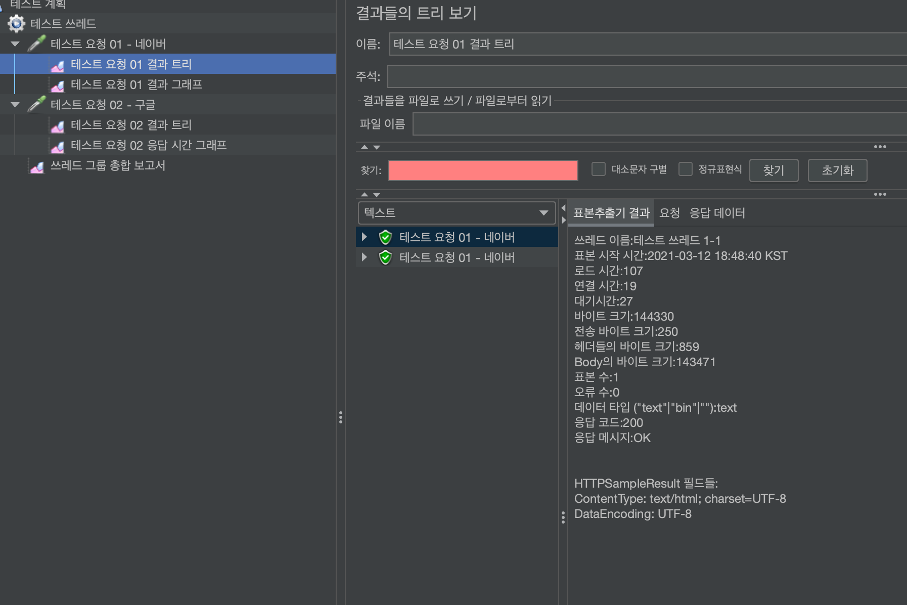 가장 작은 리스너에는 해당 쓰레드의 결과가 나타난다. 요청으론 실행된 주소가 나타나고 응답 데이터는 호출된 결과를 반환한다