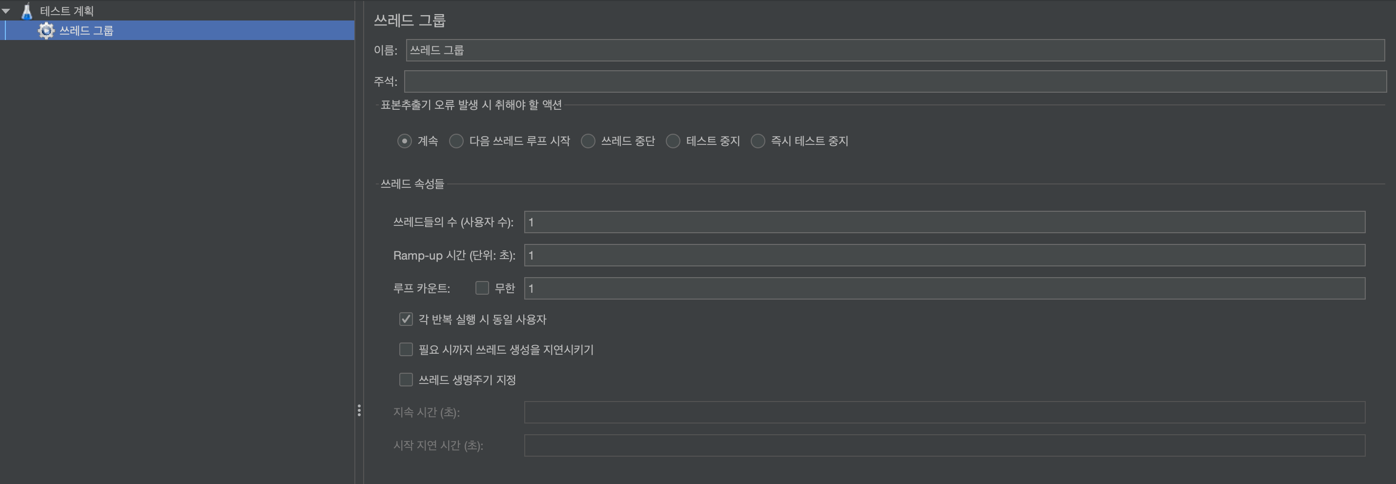 루프 카운트 : 가상의 사용자들이 몇번 반복할 것인지 정한다. 무한 체크박스를 선택하면 정해진 시간동안 무제한으로 실행된다.